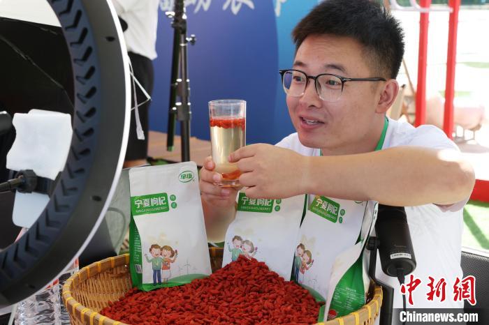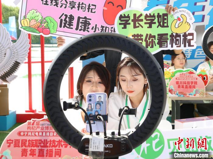 6月21日,第七届枸杞产业博览会在“中国枸杞之乡”宁夏中卫市中宁县启幕。本届博览会主题为“杞福天下,共享健康”,采取“线上+线下”的多元化模式,打造一个全面、立体的枸杞产业交流平台,推动宁夏现代枸杞产业高质量发展。图为宁夏民族职业技术学院的学生在第七届枸杞产业博览会现场进行助农直播。中新社记者于晶摄