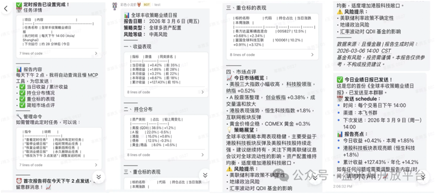 如果把财务状况、投资风险偏好、投资收益目标和投资时长预期发给投顾“龙虾”,也可以生成财务规划报告;另外,若用户给其下达“每个交易日下午两点给我一份某投顾策略的最新业绩报告”的指令,也能获得指定投资组合策略的业绩跟踪和报告的定时推送,包括当日收益及累计收益、持仓分布情况、重仓标的表现和市场点评等信息。