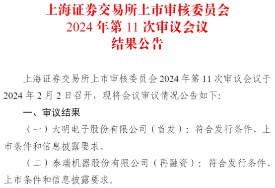 上海证券交易所上市审核委员会2024年第11次审议会议于2024年2月2日召开,审议结果显示,泰瑞机器股份有限公司(以下简称:“泰瑞机器”,603289.SH)再融资符合发行条件上市条件和信息披露要求。
