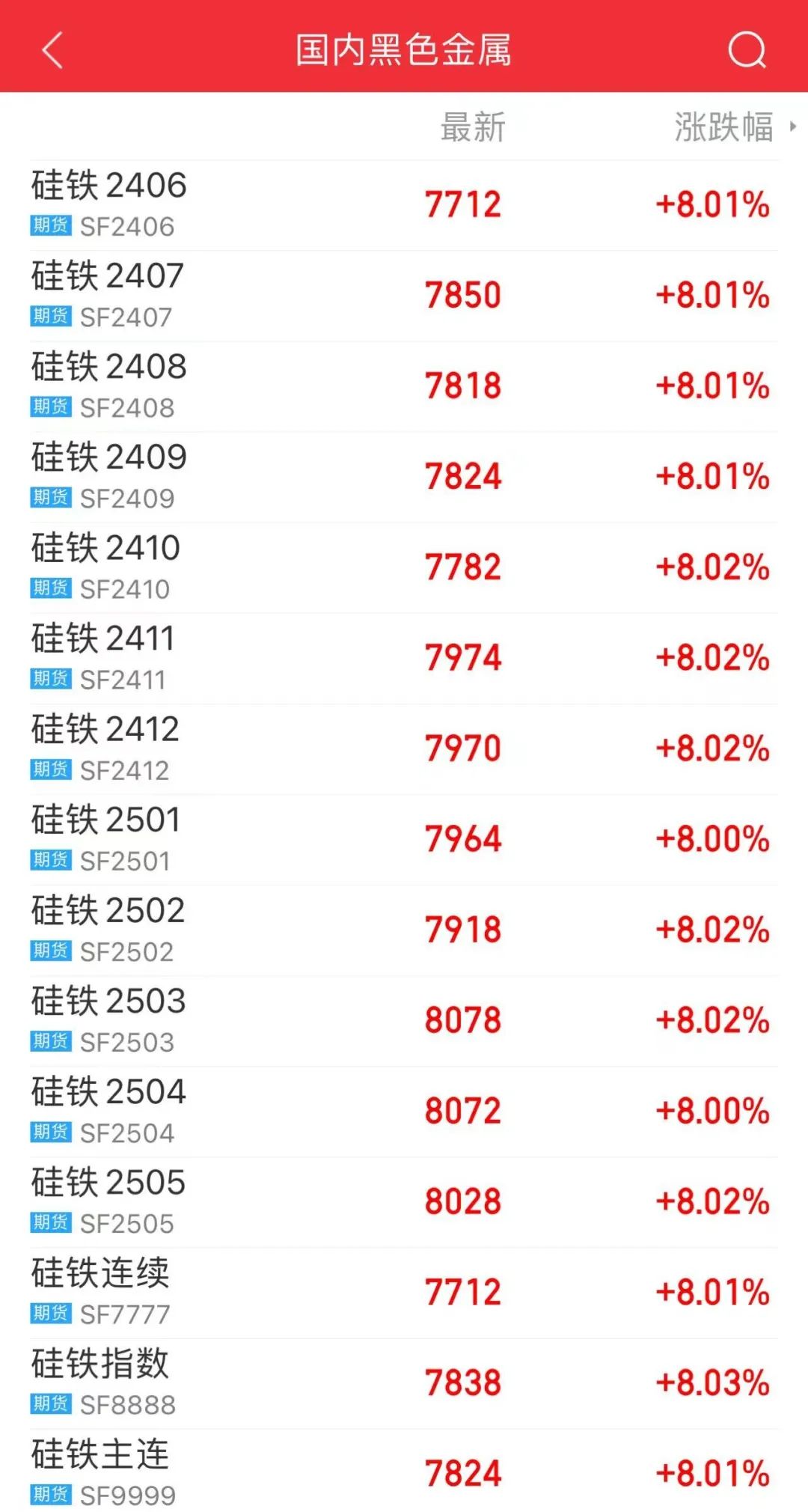 昨日早盘,硅铁主力合约2409强势涨停,截至收盘,硅铁期货全线涨停。
